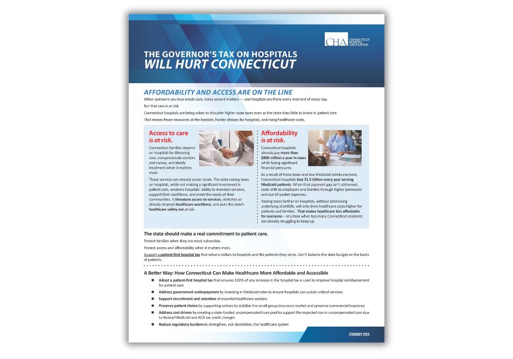 CHA is voicing serious concern over Governor Lamont’s FY 2027 budget adjustment proposal related to the provider tax paid by Connecticut hospitals, warning that it threatens healthcare access and affordability.