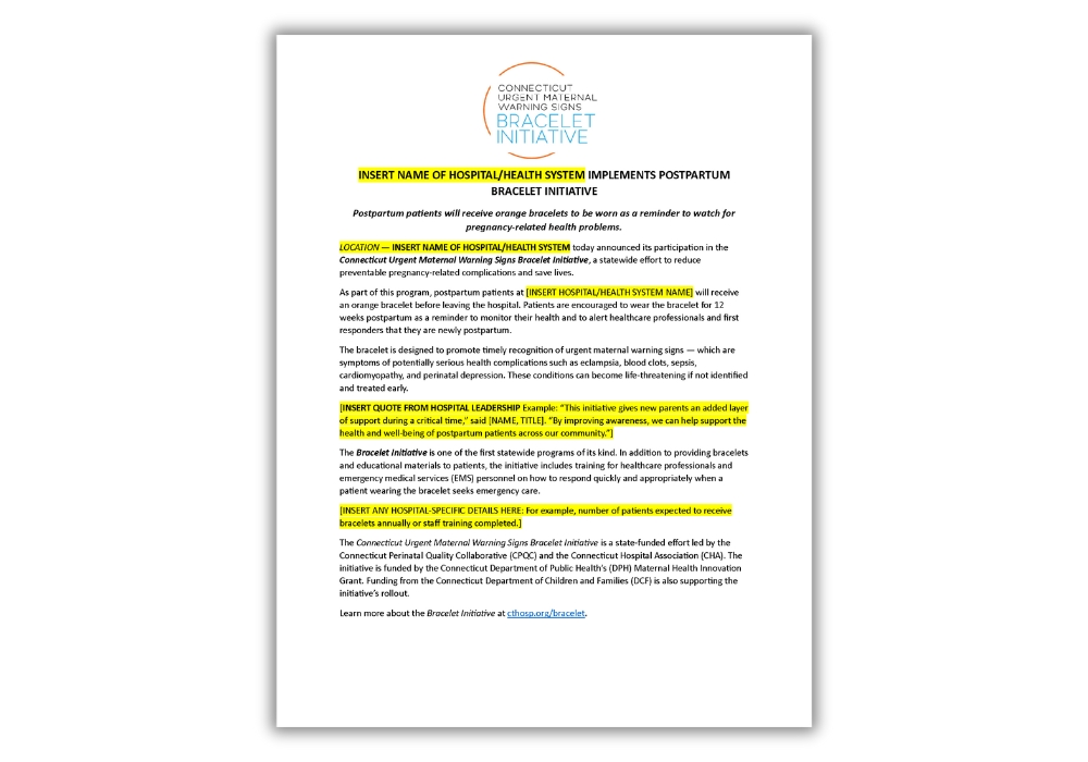 Participating hospitals are welcome to download and customize the press release template to assist in messaging around their facility’s Bracelet Initiative implementation. Click the link below to download the document.