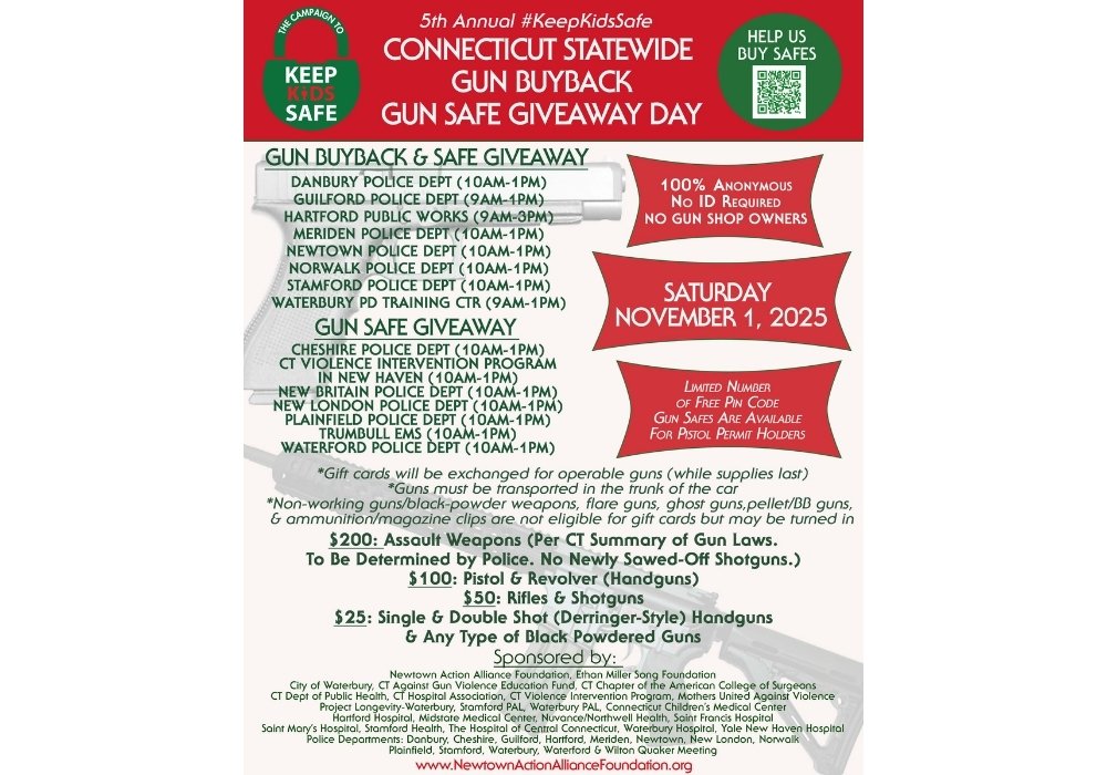 The Connecticut Hospital Association (CHA) is proud to support the Newtown Action Alliance Foundation’s 5th Annual #KeepKidsSafe Connecticut Statewide Gun Buyback and Gun Safe Giveaway Day on Saturday, November 1.
